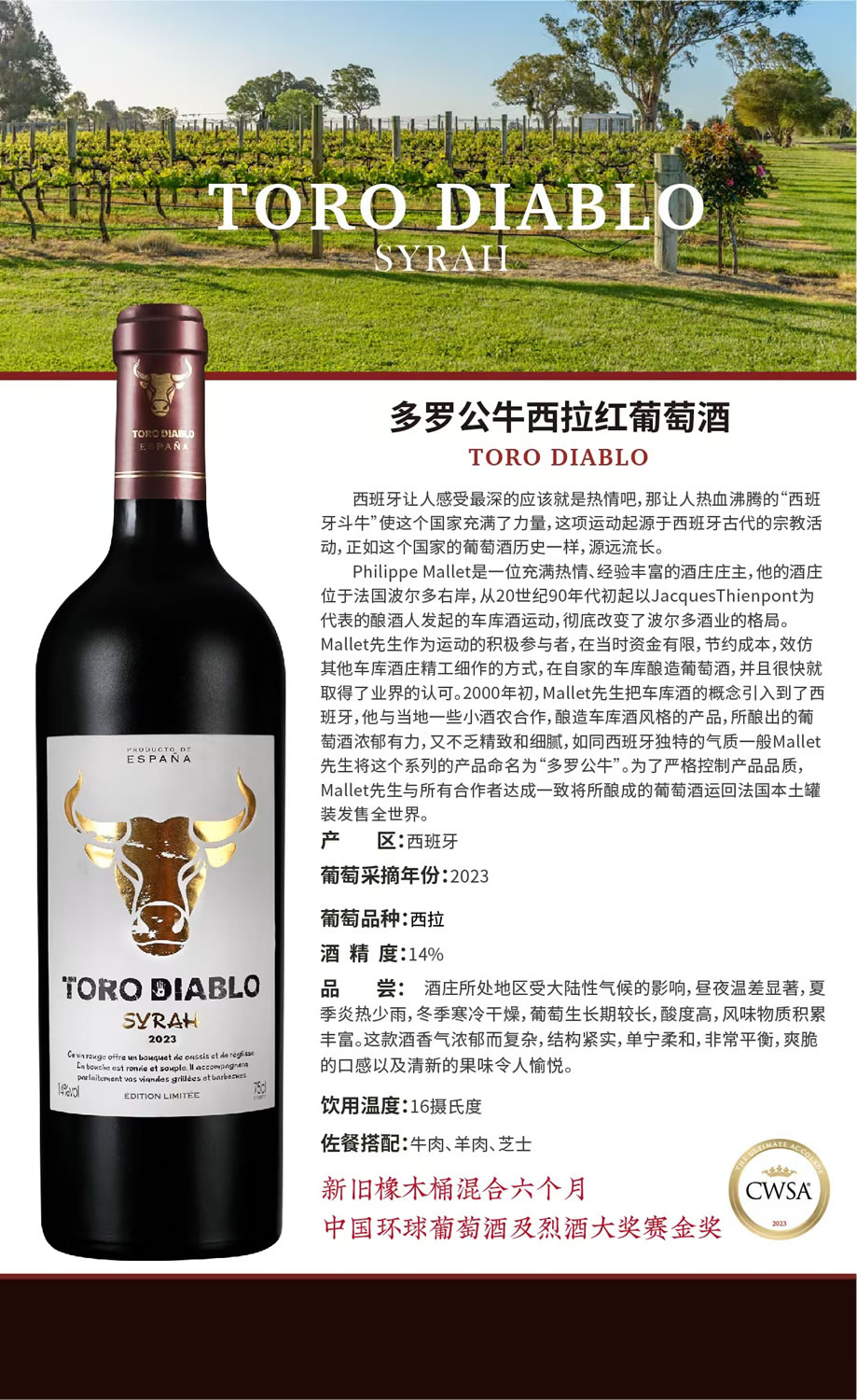 酒品介绍:酒庄所处地区受大陆性气候的影响,昼夜温差显著,夏季炎热少雨,冬季寒冷干燥,葡萄生长期较长,酸度高,风味物质积累丰富。这款酒香气浓郁而复杂,结构紧实,单宁柔和,非常平衡,爽脆的口感以及清新的果味令人愉悦。新旧橡木桶混合六个月。
